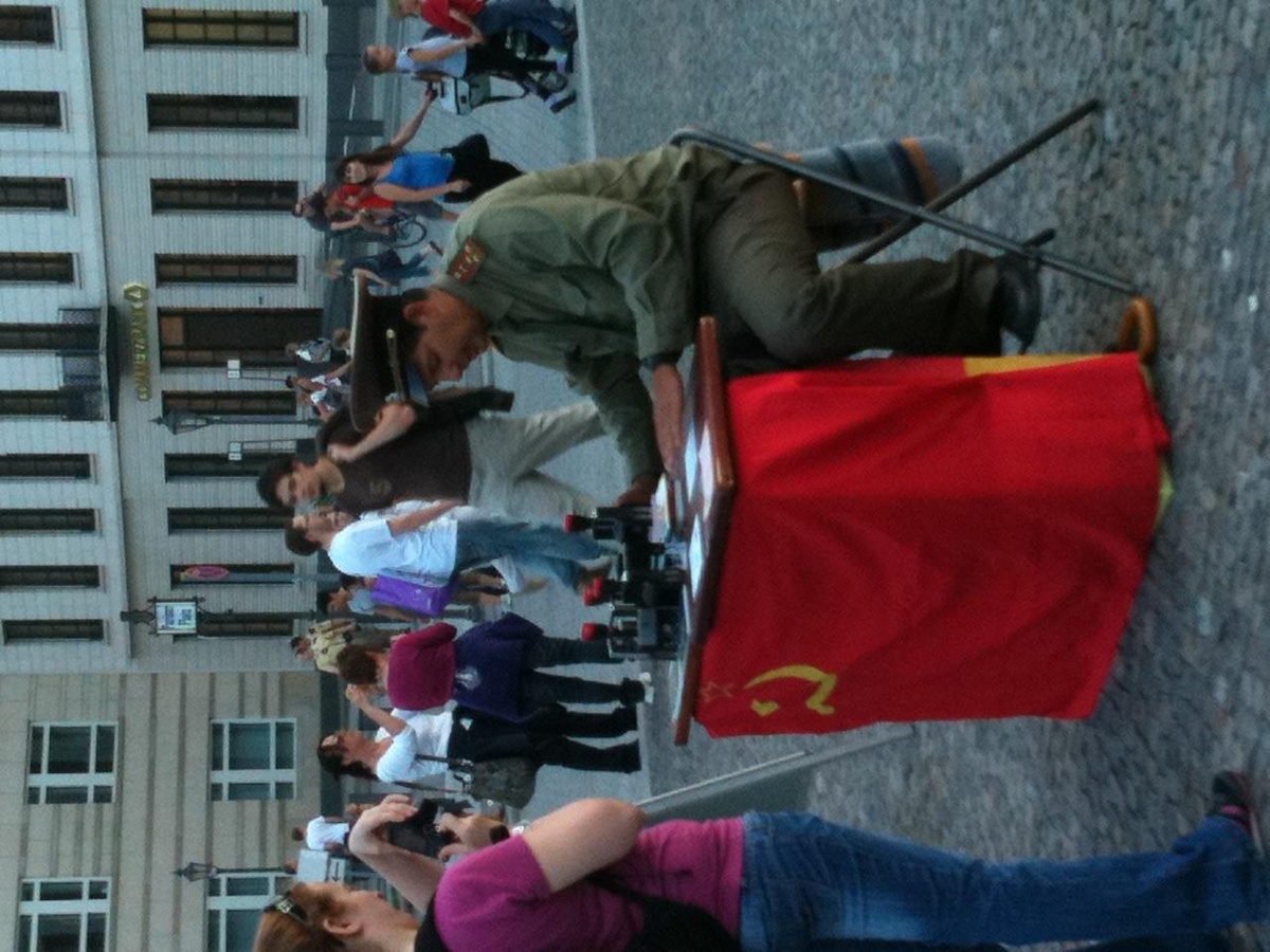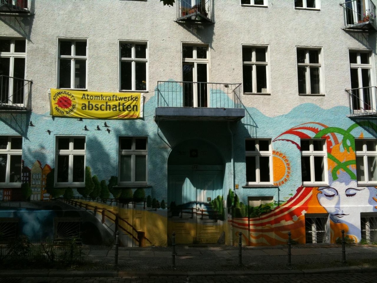 Als wir später am Fraenkelufer und Paul-Lincke-Ufer radeln, gibt’s Utopien haufenweise, aber nur noch als Mainstream-Außenseitertum und Folklore. Bunt bemalte Pippi-Langstrumpf-Häuser mit süßen Anti-AKW-Transparenten (noch nicht von der Jungen Union) und im Café Übersee genießt die kess-kluge TV-Moderatorin Pegah Ferydoni ebenso den schönen Sommertag wie all die gezeichneten Krisenverlierer als Gäste oder Prekariats-Kellner. Der Cappuccino ist nicht schlecht hier. Das finden vor allem unzählige Wespen. Wessi-Plage, einmal anders. Wir radeln noch an Boule-Plätzen vorbei bis zum Schlesischen Tor, um dort B.‘s Lieblingspizza Amore zu verdrücken, im Höllen-Lärm des Verkehrs und eines Sandstrahlers, mit dem die Brücke bearbeitet wird. Danach verfahren wir uns im Osten gnadenlos, finden nur mit Mühe aus Friedrichshain zurück nach Mitte. Na, wenn das nicht Symbolkraft genug hat.