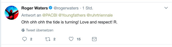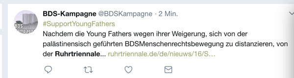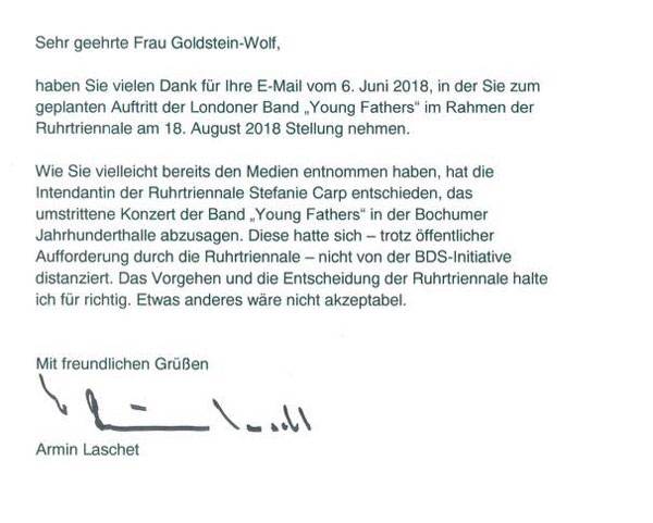 Die Entscheidung der Ruhrtriennale-Intendantin Stefanie Carp, die Young Fathers doch wieder zu dem Festival einzuladen findet viel Zustimmung. Vor allem Antisemiten und Israelhasser sind begeistert. Die Band, die der Meinung ist, das kein Musiker in Israel auftreten darf und das Land auch wirtschaftlich und wissenschaftlich isoliert werden muss, soll im August in Bochum auftreten. Aber es gibt auch Kritik an Carps Entscheidung: