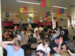 Von Gründonnerstagabend bis zum Ostermontag am Nachmittag müssen die Spieler sieben Spiele absolvieren. Da bleibt für die traditionelle Ostereiersuche praktisch keine Zeit. Die Leute die sich bei diesem Event treffen, suchen meist auch keine Eier auf der Wiese, sondern auf den 64 Feldern des Schachbretts.Schach ist ja bekanntlich so etwas wie Eiersuchen! Man sucht nämlich die Fallen, die der Gegner gestellt hat, oder die Schwachstellen, die der Gegner in seiner eigenen Spielanlage eingebaut hat. Dabei sitzen sich zwei Spieler gegenüber, die beide angestrengt auf das Brett mit den 64 Feldern, das zwischen ihnen liegt, starren. Wo droht da Gefahr? Wo kann ich was gewinnen? Wo sind die Eier versteckt? Dass der Gegner seine Dame versehentlich stehen lässt, obwohl sie angegriffen ist, ist so selten, wie ein rotes Osterei mitten auf der grünen Wiese. Ganz wie im normalen Leben, sind die Eier auf den 64 Feldern nicht so leicht zu finden. Die Zuschauer haben es da leichter, sie haben ja bekanntlich den Vorteil, dass sie meist besser als die Spieler selber, die Situation überblicken, dürfen aber auf keinen Fall etwas sagen. Deshalb sieht man gelegentlich, wie ein Zuschauer ganz aufgeregt den Saal verlässt, um draußen, mit anderen Zuschauern über die Spielsituation zu diskutieren. Draußen, da sind auch die Raucher, die zwischen zwei Spielzügen hastig einen süchtigen Zug aus der Zigarette machen, um danach gleich wieder schnellen Schrittes in den Spielsaal hineinzugehen, weil ihre Uhr ja läuft. Es gibt nämlich 1000 Euro zu gewinnen. Die Preisverleihung findet am Ostermontag um 16:30 Uhr statt.