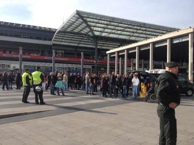 13.15 Uhr: Wir sind vor Ort und sind beeindruckt. „Unglaublich viel Polizei… die haben alles aufgefahren!“ Vom Wasserwerfer bis zum gepanzerten Räumwagen, alles dabei. Die Polizei demonstriert rund um den Kölner Bahnhof Stärke. Unterdessen kann man auf twitter verfolgen, dass weiterhin Gruppen und Grüppchen, teilweise angeblich bis zu 200 Leute, von Hooligans auf dem Weg nach Köln sind.