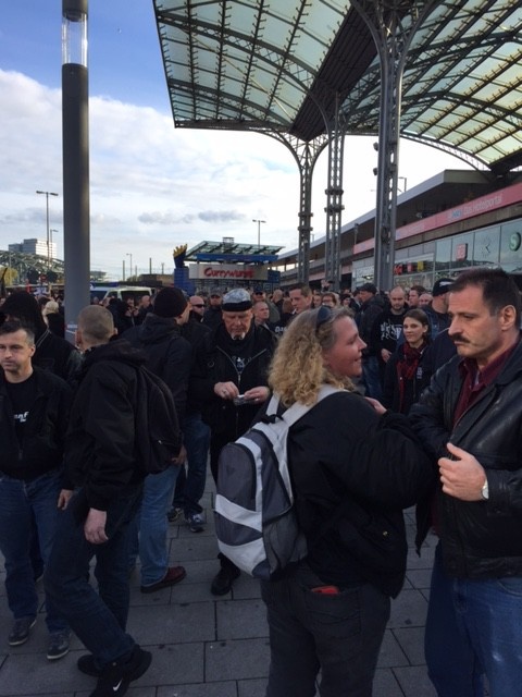 15.03 Uhr: Nun sind es 3000 deutlich dem rechtsextremen Spektrum zuzuordnende Hooligans, die auf dem Breslauer Platz herumstehen und sich von „Kategorie C“ beschallen lassen. Die der Neonaziszene zuzurechnende Band aus Bremen hat mit ihrem Auftritt begonnen… Um die Veranstaltung herum erstaunlich wenig Polizei im Einsatz.