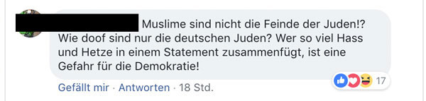 Getroffene Hunde bellen! Die Beiträge zeigen, dass das Verhältnis der AfD-Funktionäre, -Mitglieder und -Anhänger zu den in Deutschland lebenden Juden ein rein taktisches ist. So lange sie Opfer des muslimischen Antisemitismus sind, ist alles ok, aber wehe, sie wehren sich gegen den deutschen Antisemitismus und sie bezeichnen die AfD als das, was sie ist: als „antidemokratische, menschenverachtende und in weiten Teilen rechtsradikale“ Partei – dann ist es vorbei mit der vermeintlichen Solidarität.