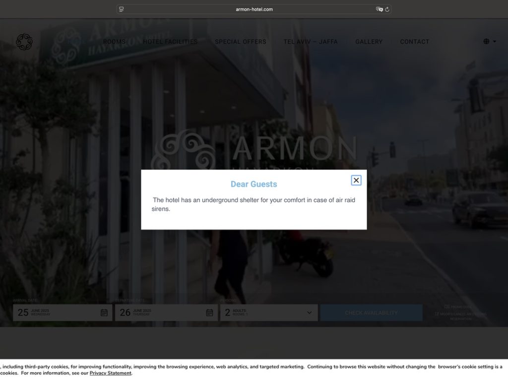 Das Armon Hayarkon ist, bei Besuchen in Israel, mein Stammhotel: In Strandnähe, gleichzeitig nicht weit von der Dizengoffstraße entfernt, in der, in normalen Zeiten, das Leben tobt. Normale Zeiten haben wir aktuell nicht, Israel wird seit dem 13.06.2025 von den Mullah-Terroristen des Irans beschossen.