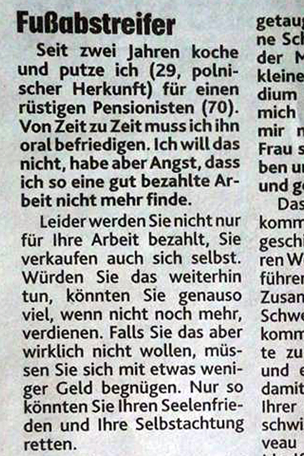 „Seit zwei Jahren putze ich (…) für einen rüstigen Pensionisten (70). Von Zeit zu Zeit muss ich ihn oral befriedigen. Ich will das nicht, habe aber Angst, dass ich eine so gut bezahlte Arbeit nicht mehr finde.“