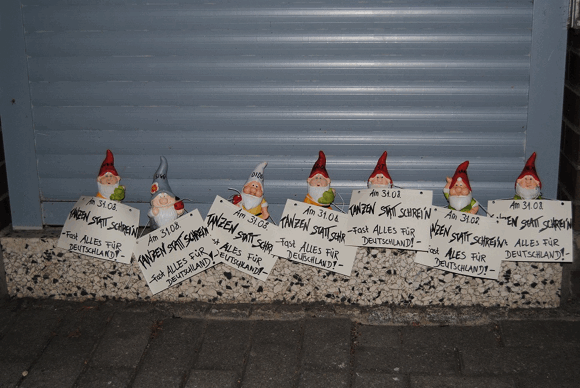 Zu einem ungewöhnlichen Protest gegen die Nazipartei „Die Rechte“ kam es in der vergangenen Nacht in Dortmund. Vor dem Parteibüro zogen sieben Zwerge auf und forderten die Rechtsradikalen auf, am Samstag zu tanzen statt zu schreien. Die Namen der Zwerge, auf die Zipfelmützen geschrieben, waren Andeutungen der Namen bekannter Dortmunder Rechtsradikaler. In einem Bekennerschreiben, das diesem Blog vorliegt, heißt es: „wir sind eine Gruppe genervter Dortmunderinnen und Dortmunder, die keine Lust mehr auf die ewigen Naziaufmärsche in unserer Stadt haben. Daher fordern wir die stadtbekannten Kameraden auf, diesmal doch einfach zu tanzen, statt schon wieder ihre ausgelutschten Parolen zu gröhlen.“