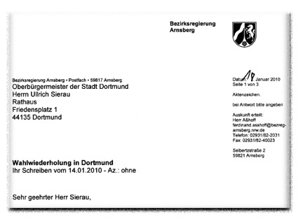 In einem Schreiben von Ferdinand Aßhoff, dem Hauptdezernenten der für Dortmund zuständigen Kommunalaufsicht des Regierunsbezirks Arnsberg an Dortmund OB Ullrich Sierau, stellen Land und das Regierungspräsidium heute klar, dass sie sich wegen der Frage der Rechtssicherheit nicht zu der Zulässigekit der Klagen verschiedener Bürger gegen die OB-Wahl äussern werden und auf eine Entscheidung des Verwaltungsgerichts Gelsenkirchen warten.