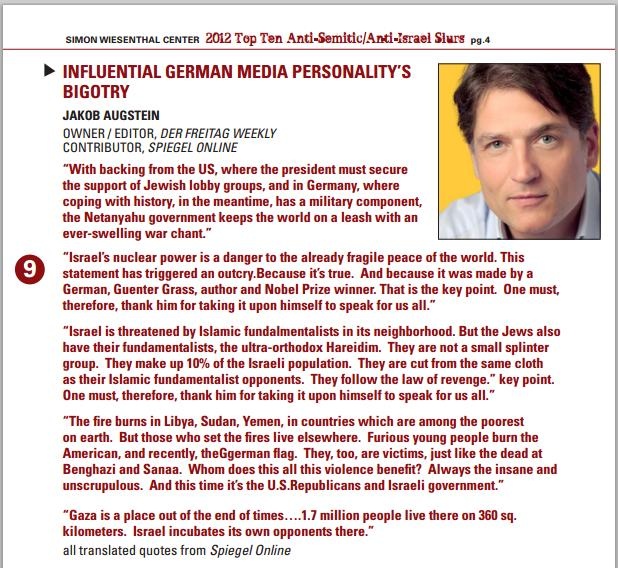 Wenn J.Augsteins journalistische Arbeit aufgrund einer politischen, interessensgerichteten Wertung d.d.Simon-Wiesental-Center einen vorderen Platz auf der Liste „Anti-Israel-Slurs“ erhält, dann kann darüber politisch-interessensgerichtet diskutiert werden, dann ist das aber nicht a priorie als unhaltbar zurückzuweisen, so wie ich es bezüglich einer Liste über Antisemiten mit einem vorderen Platz für J.Augstein für notwendig und geboten halte.