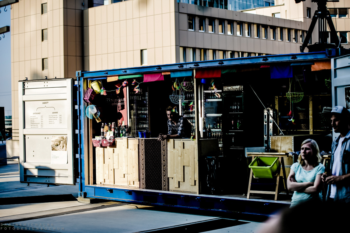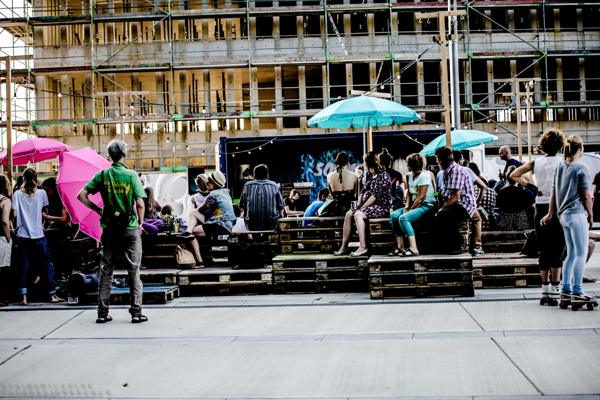 Larissa Prinz und Marie Träger von Prinzträger aus Bochum ist es wunderbar gelungen, mit wenigen Mitteln eine Wohlfühloase zu schaffen…mit Sitzmöglichkeiten, einer kleiner „Schrebergartenlauben-Bar“ und einer ebensolchen Bühne. … die zum Entspannen, netten Gesprächen, Mitmachen und Zuhören einlädt.