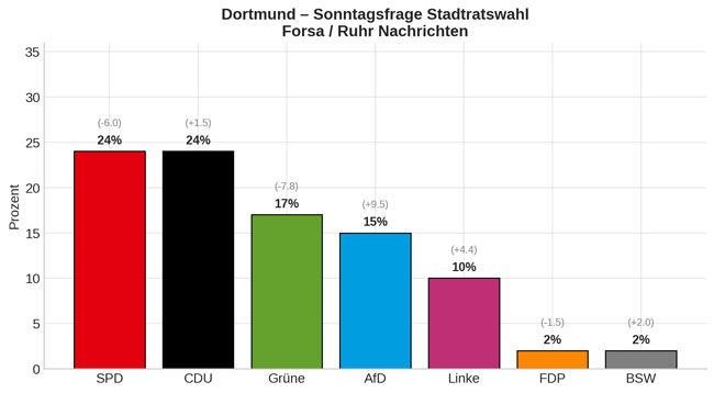 Nach einer im Auftrag der Ruhr Nachrichten vom Institut Forsa erstellten Umfrage zur Kommunalwahl am 14. September steht der SPD in Dortmund ein Desaster bevor: Sie könnte demnach von 29,9 auf nur noch 24 Prozent abstürzen. Auch die Grünen müssen sich auf große Verluste einstellen: Statt wie 2020 fast 25 Prozent kämen sie nur noch auf 17 Prozent. Gewinner der Wahl könnten nach den Forsa-Zahlen die radikalen Ränder werden: Die AfD steigt demnach von 5,4 auf 15 Prozent, die Linke von 5,6 auf 10 Prozent.