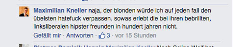 Der junge Mann rechts ist Maximilian Kneller. Er ist stellvertretender Vorsitzender der Jungen Alternativen NRW, was zwar nach einem dämlichen Hippieverband klingt, aber der dämlicher Jugendverband der AfD ist. Herr Kneller geht sehr offen mit seinen sexuellen Fantasien um und teilt sie mit vielen anderen Menschen auf Facebook: