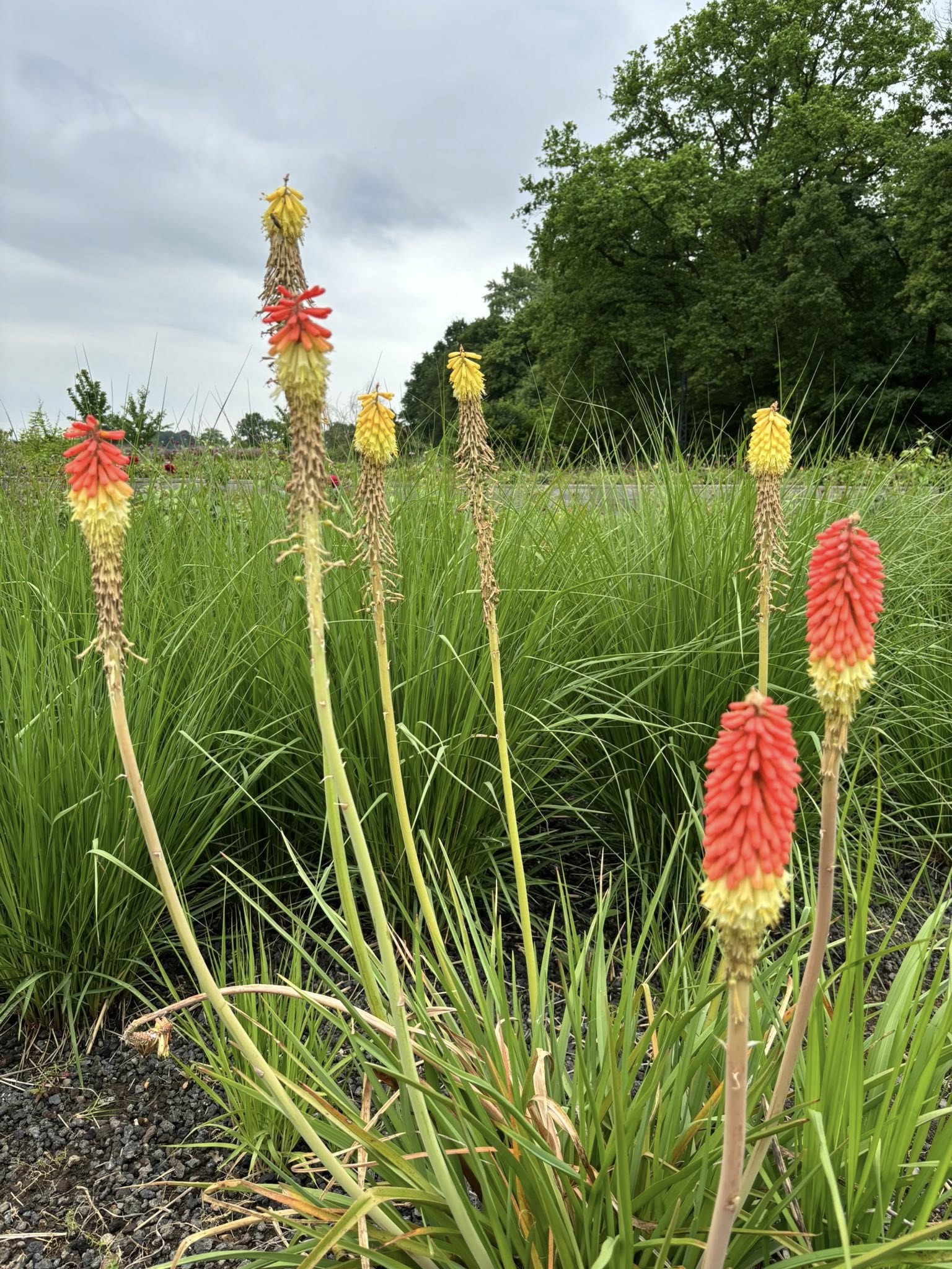 Besonders gelungen ist die Mischung aus altem Industrieerbe und neuer Lebensqualität. Überall finden sich kleine Hinweise auf die Vergangenheit: rostige Kunstobjekte, alte Rohrleitungen, geschickt in die Gestaltung integrierte Relikte der Klärwerkszeit. Gleichzeitig sorgen Biotope, Streuobstwiesen und ein renaturierter Bachlauf für Frischluft und Artenvielfalt.
