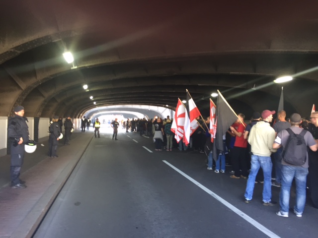 14.30 Uhr: Die Polizei lässt in Rufweite der Nazi Demonstration Gegenprotest weitgehend zu. Zwei Veranstaltungen finden dort gerade ab, aber es bleibt auch weiterhin ruhig und friedlich.