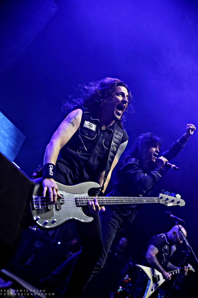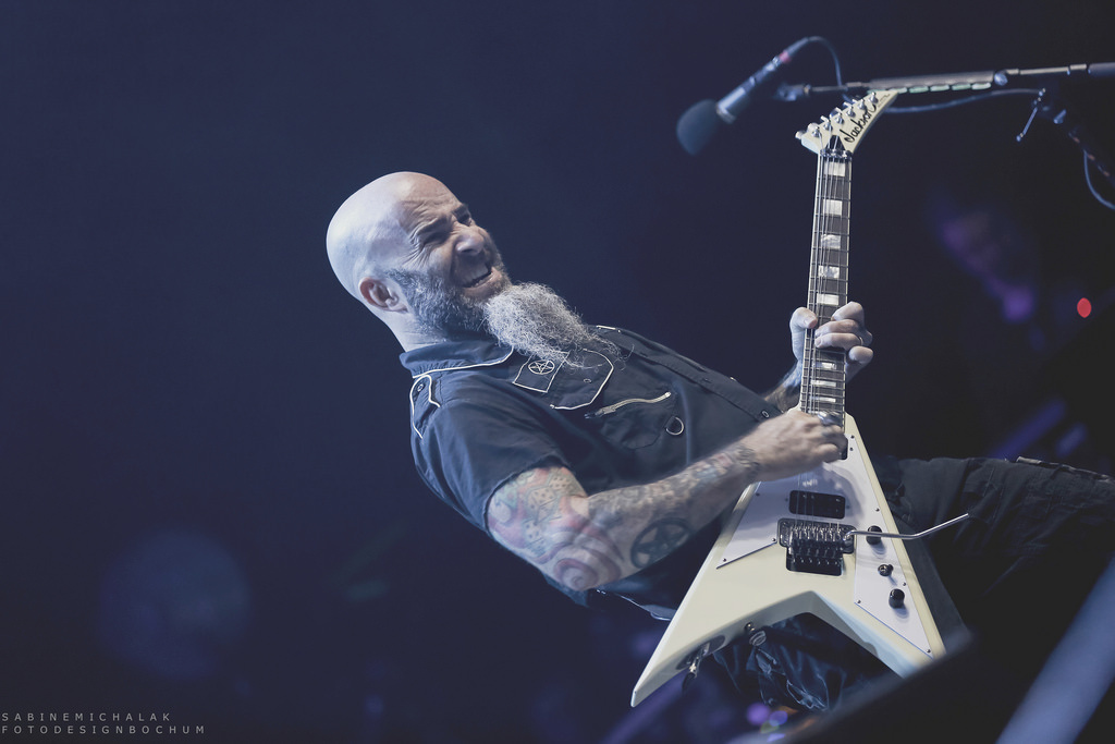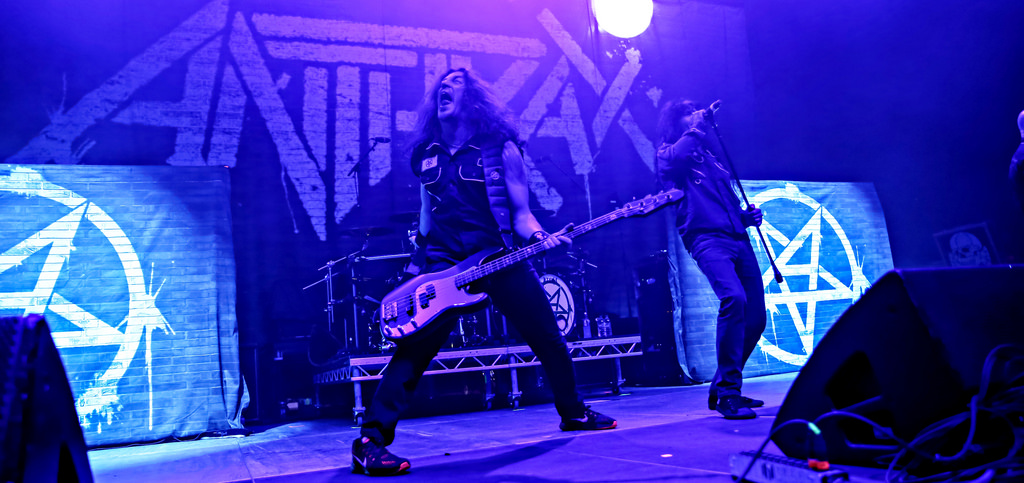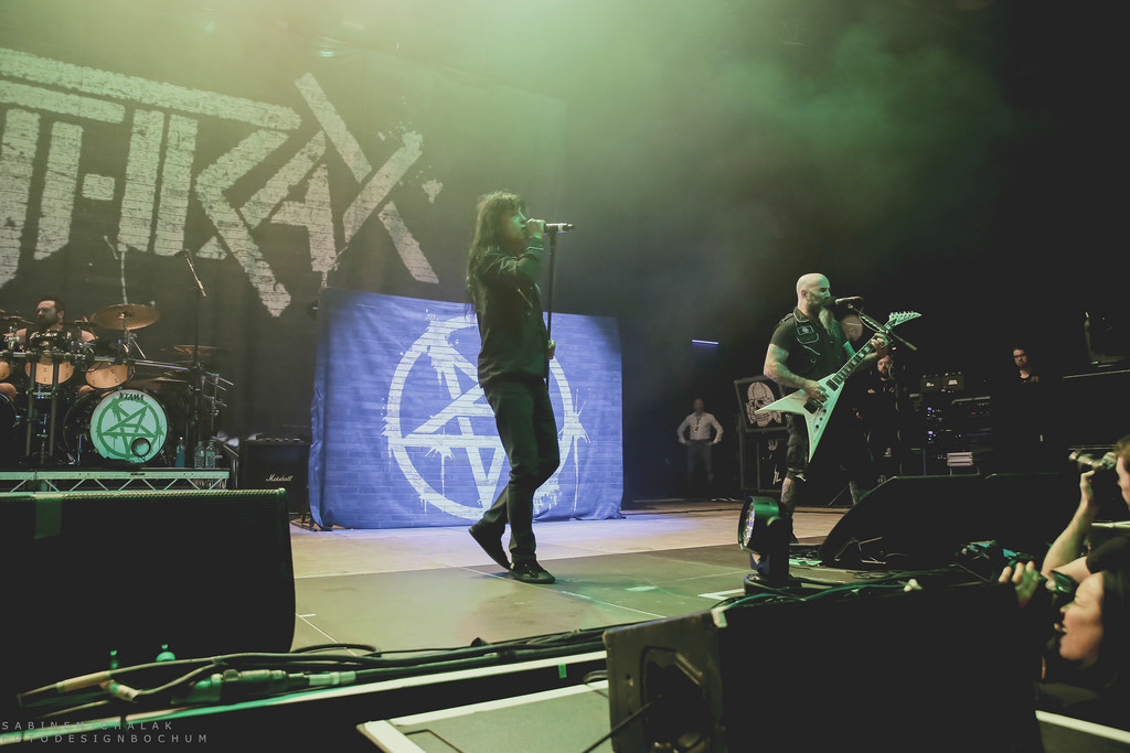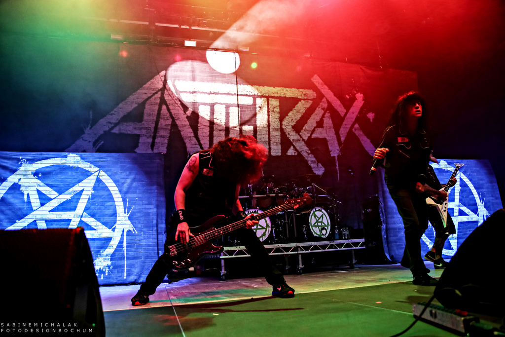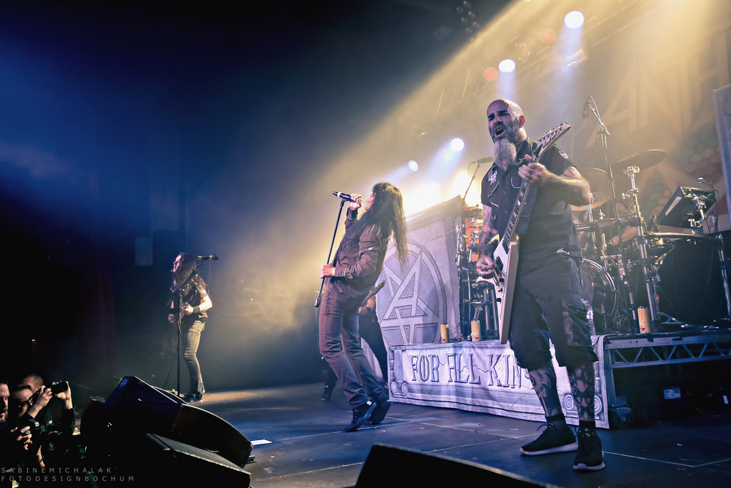 Ohne von einer Vorband eingestimmt worden zu sein, hieß es dann um halb neun „Ohren abdichten“ um sich dem mächtigen Gewitter der New Yorker Thrash-Metal-Ikone zu ergeben. Ausverkauft war das Konzert zwar nicht, aber auf die anwesenden kuttentragenden Metal-Fans war absolut Verlass. Als Anthrax, um den Gitarristen Scott Ian, noch einzig verbliebenes Gründungsmitglied der Band, die in satte Farben eingetauchte Bühne stürmten, wurden sie lautstark begrüßt und mit Begeistung gefeiert. Direkt zu Beginn präsentierte Sänger Joey Belladonna zwei neue Songs des aktuellen Albums „For All Kings“ – “You Gotta Believe” und “Monster at the End” und lief dann zum dritten Song „Caught In A Mosh“ aus dem Jahre 1987 zu Höchstformen auf. Er unterhielt sich gut gelaunt mit dem Publikum, trank Dosenbier, versetzte seine Fans in einen regelrechten Metal-Rausch und erhob den Dienstagabend in Köln zu einem wahrem Metal-Feiertag.