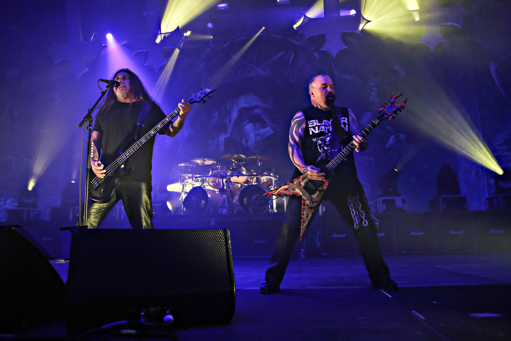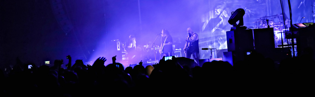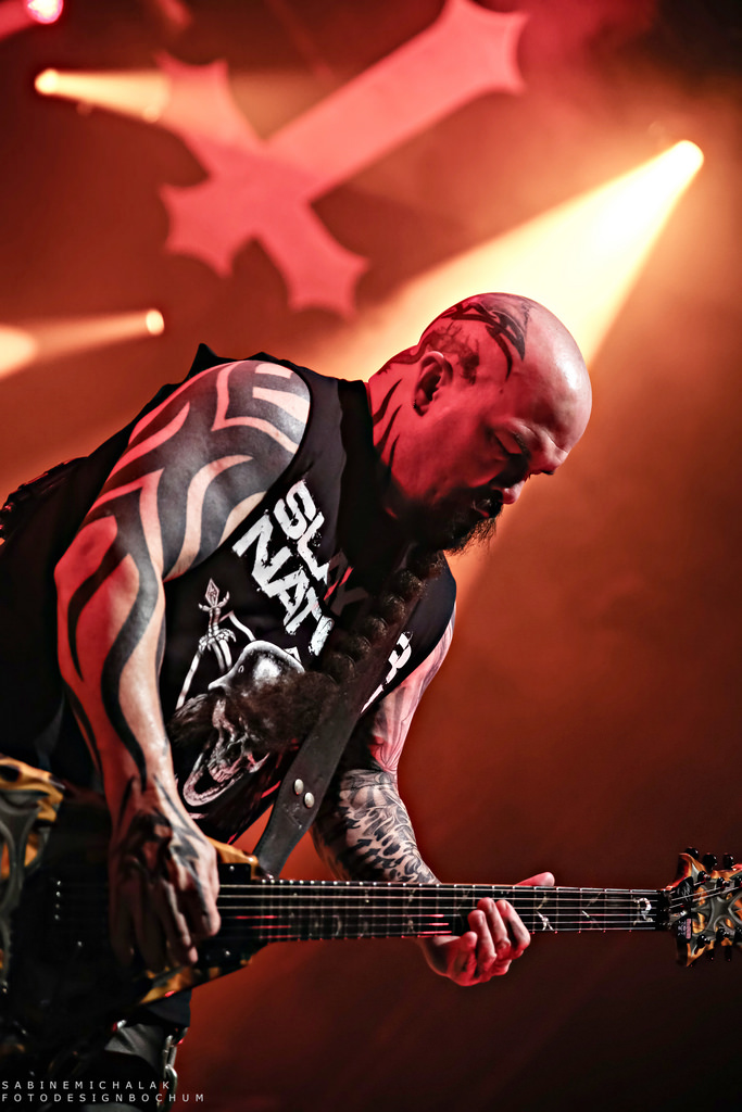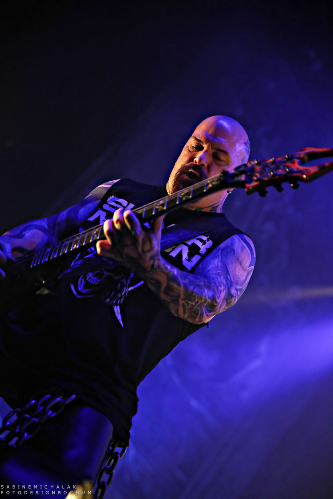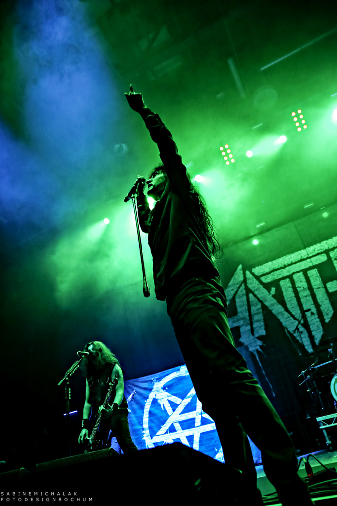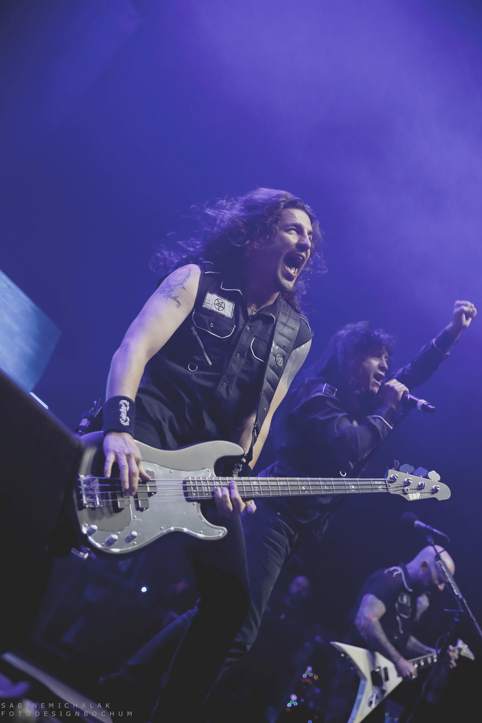 Ohne von einer Vorband eingestimmt worden zu sein, hieß es dann um halb neun „Ohren abdichten“ um sich dem mächtigen Gewitter der New Yorker Thrash-Metal-Ikone zu ergeben. Ausverkauft war das Konzert zwar nicht, aber auf die anwesenden kuttentragenden Metal-Fans war absolut Verlass. Als Anthrax, um den Gitarristen Scott Ian, noch einzig verbliebenes Gründungsmitglied der Band, die in satte Farben eingetauchte Bühne stürmten, wurden sie lautstark begrüßt und mit Begeistung gefeiert. Direkt zu Beginn präsentierte Sänger Joey Belladonna zwei neue Songs des aktuellen Albums „For All Kings“ – “You Gotta Believe” und “Monster at the End” und lief dann zum dritten Song „Caught In A Mosh“ aus dem Jahre 1987 zu Höchstformen auf. Er unterhielt sich gut gelaunt mit dem Publikum, trank Dosenbier, versetzte seine Fans in einen regelrechten Metal-Rausch und erhob den Dienstagabend in Köln zu einem wahrem Metal-Feiertag.