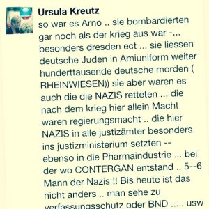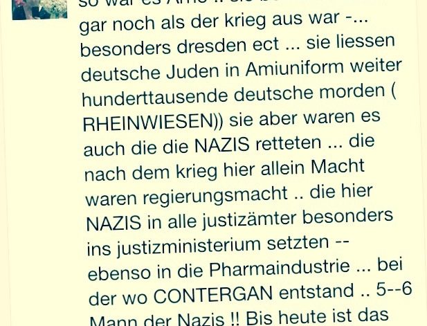 Es findet sich der ganze Blumenstrauss abseitiger Fantasien vom antisemitischen „USrael“ über Todesschwadronen, „deutsche Juden in Amiuniform“, in den „RHEINWIESEN“ bis hin zu originellen Contergan-Theorien.