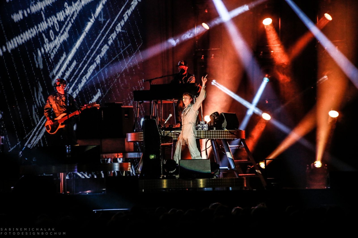 In der Dortmunder Westfalenhalle ist alles dunkel. Zu den Klängen der Fimmusik von „2001: Odyssee im Weltraum“ betreten die fünf Briten in Astronauten-Overalls die große Bühne – man kann sie erst nur erahnen, und dann beginnt es um sie herum zu blitzen und die Sterne zu leuchten.