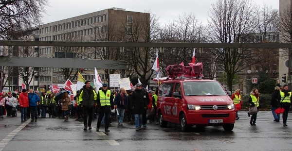 Die Teilnehmer wollten durch ihren Demonstrationszug den Druck auf die Tarifverhandlungen für die ca. 36.000 Beschäftigten der AWO erhöhen, in denen bisher, trotz immerhin schon fünf Verhandlungsrunden, noch immer kein Durchbruch erzielt werden konnte.