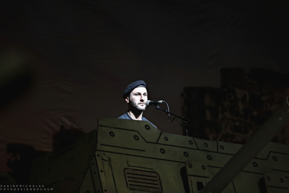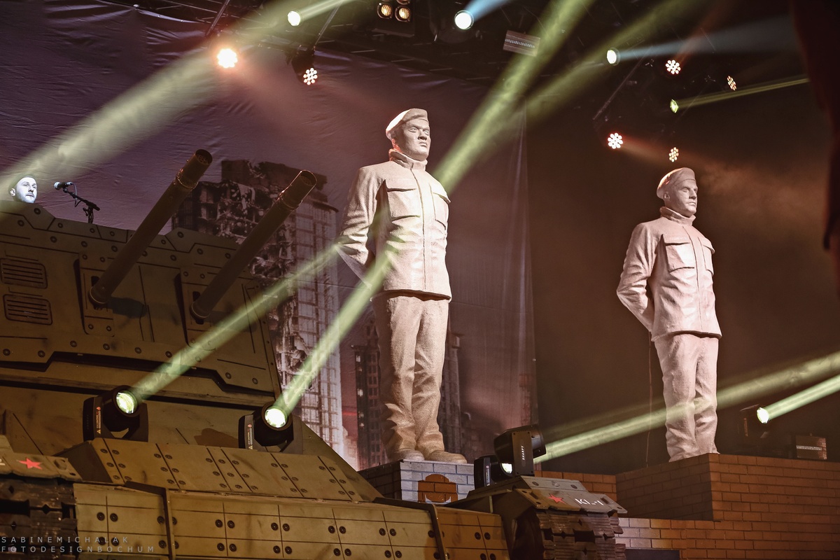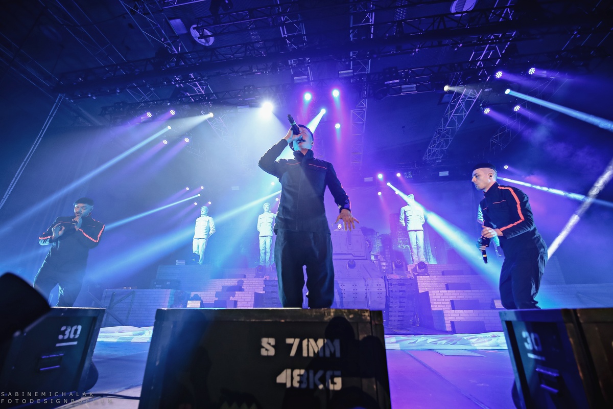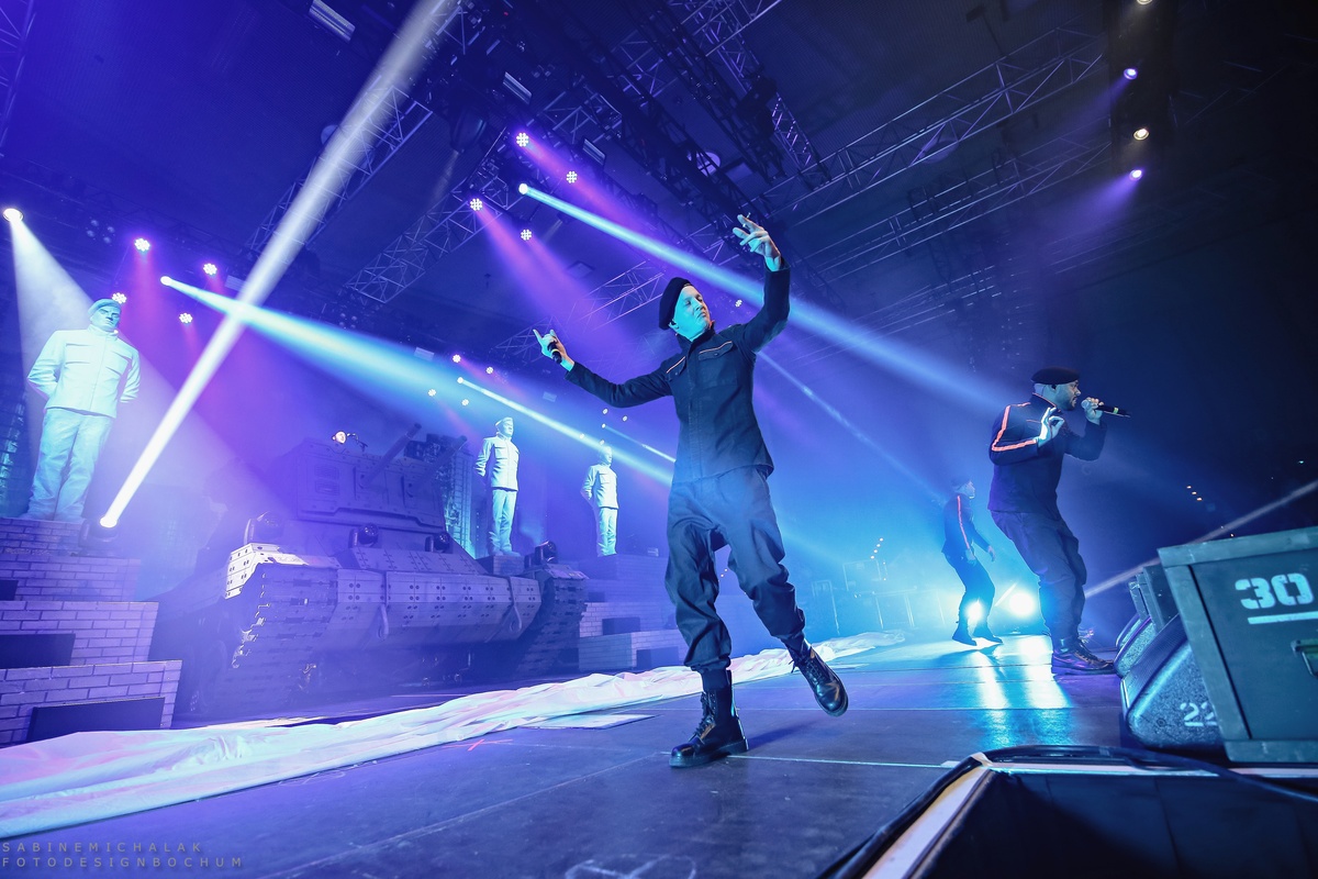 Ich war für euch gestern in Essen mit dabei und konnte mich selber davon überzeugen, wie die Berliner die ausverkaufte Grugahalle zum Toben brachten. Unter dem Motto “ Hurra die Welt geht immer noch unter“, tourt die Hip-Hop-Formation zur Zeit durch die Hallen des Landes und fährt wie immer scharfe Geschütze auf. Nicht nur, dass DJ Craft auf dem Geschützturm einer riesengroßen Panzerattrappe, umgeben von ebenfalls überdimensionalen Soldatenstatuen, auflegte, auch für ihre Provokationen, die sie in ihre Show integrierten, wurden sie mit jubelden Zurufen gefeiert.