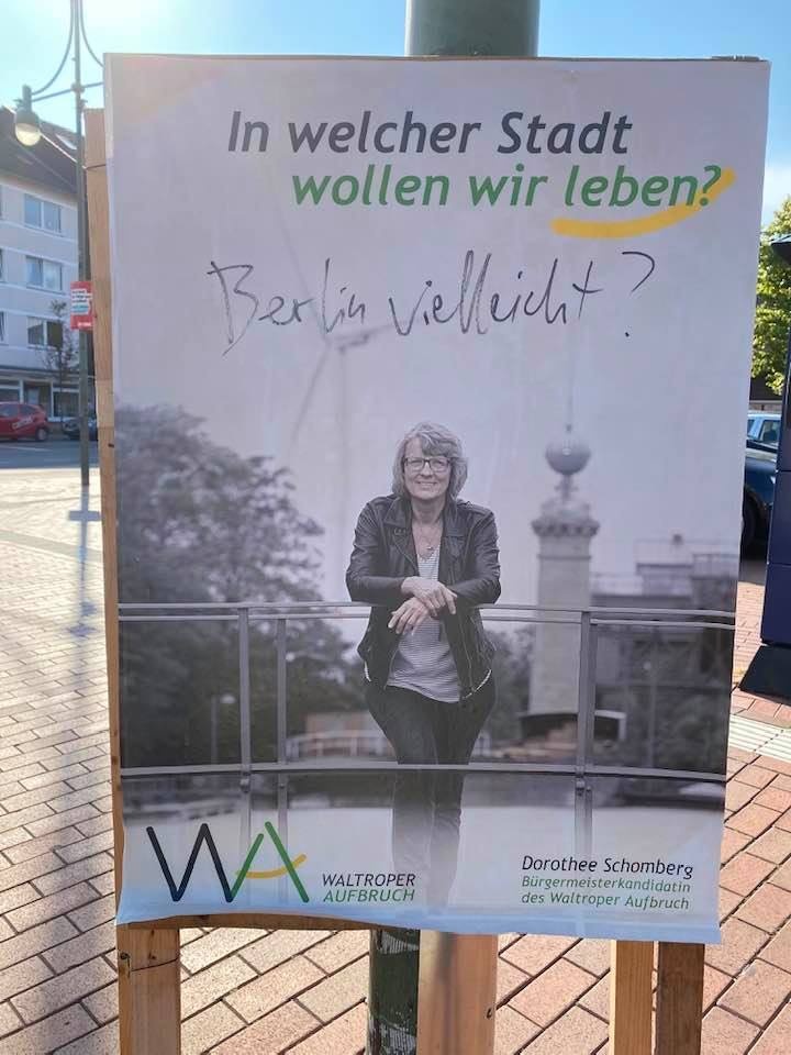Auf seinen Wahlplakaten fragt der ‚Waltroper Aufbruch‘ die Wähler im laufenden Kommunalwahlkampf, in welcher Stadt wir leben wollen. Die ehrliche Antwort einiger Waltroper erfolgte postwendend. Aber wohl nicht ganz so, wie es sich die Fragesteller ursprünglich vorgestellt hatten… 😉