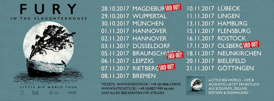 Ende April wurde im Hamburger Grünspan das Akustik-Album „Little Big World“ aufgezeichnet, mit dem sich für die Band ein Kreis schließt. Fury In The Slaughterhouse verbinden bestes musikalisches Handwerk mit emotionaler Tiefe in 23 ausgewählten Songs, die für dieses einmalige Konzerterlebnis eigens von Jan Löchel neu arrangiert wurden. „Die Akustik-Tour 25zum 30. Geburtstag ist ein Geschenk an unsere Fans und an uns selbst“, erklärt Thorsten Wingenfelder. „Ein Akustik-Set wie das, was wir auf der Little Big World Tour spielen wollen, hält unsere Band-Seele jung und lebendig. Im Endeffekt zeichnet unsere Band vor allem die Vielseitigkeit der einzelnen Mitstreiter aus. Deshalb darf das Spontane regieren und ein Drittel des vorher Geprobten klingt plötzlich ganz anders.“ Hautnah wie nie können die Fans sich bei dieser Tour überraschen lassen. Es wird klassische Fury-Songs geben, Nummern, die man in dieser Form nicht erwartet und Teile, die schmunzeln lassen. Mit aktuellem Blick auf die anstehenden ausverkauften Open-Air Termine krönt die Little Big World Tour 2017 – live & acoustic eines der erfolgreichsten Bandjubiläen Deutschlands – nicht nur für Fury In The Slaughterhouse selbst, sondern auch für ihre Fans.