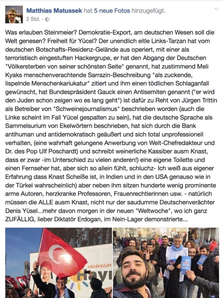 Lieber Matthias Matussek, ach was, „Lieber“, einfach nur „Matussek, du …“,