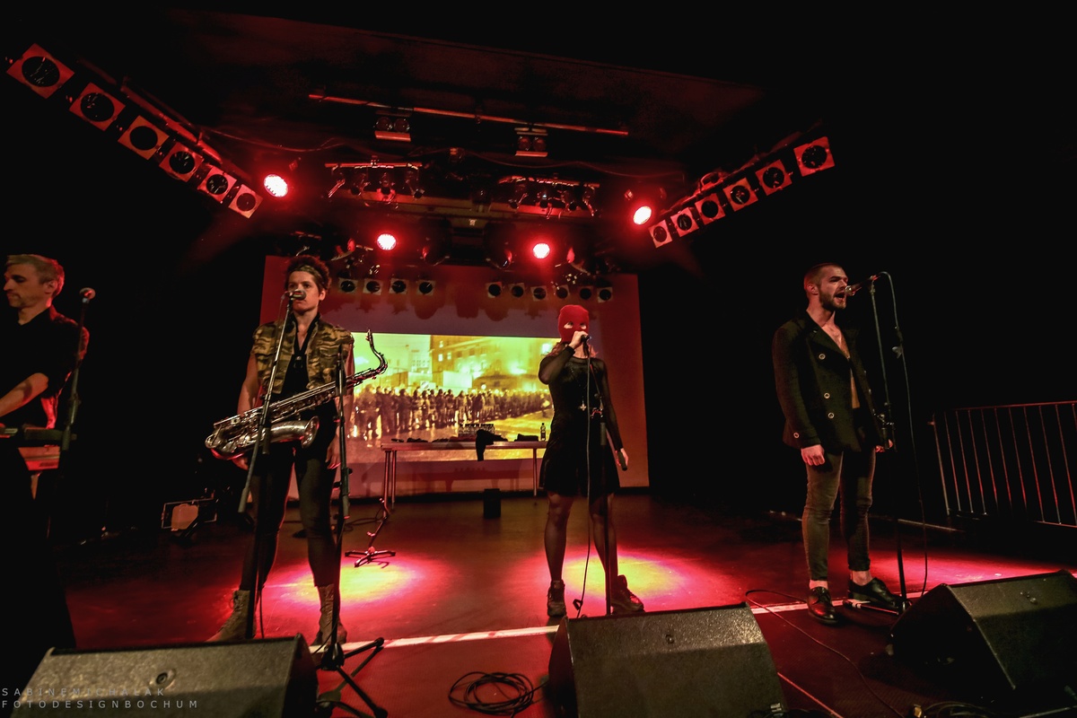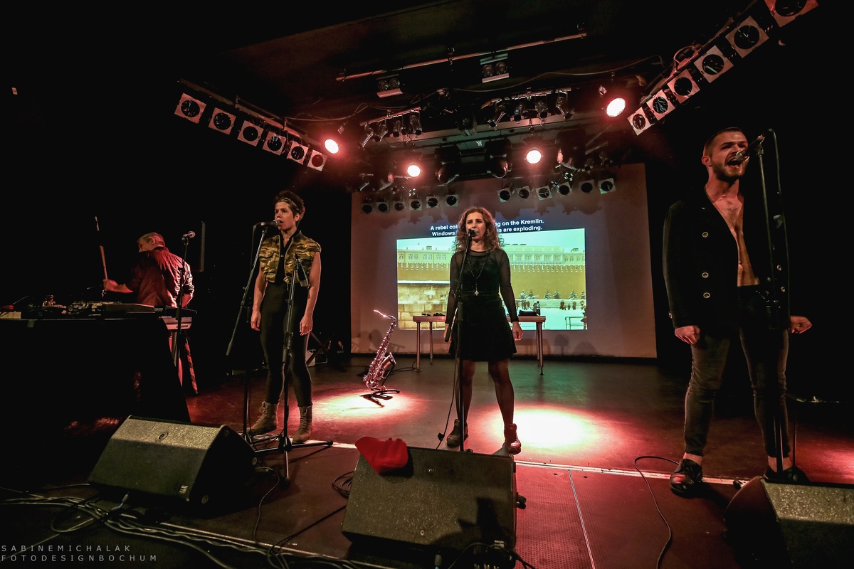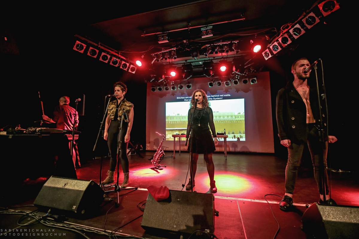 Im Hintergrund eine große Leinwand mit Videoprojektionen politischen Inhalts, boten Alyokhina und Masheka mit ihrer Stimme und Nastya Awott wahlweise am Saxofon und Maxim Awott am Keyboard ihren Gästen eine Mischung aus Dokumentation, Manifest und Proklamation, durch die sie ihre Gedanken und Gefühle mal rappend, mal punkig, aber auch mit viel Poesie zum Ausdruck brachten. Dies alles geschah mit einer Dringlichkeit und sehr energetisch, zum Teil sehr roh und minimalistisch. Die vier erlaubten sich keine Atempausen und ihren Gästen keine Denkpausen.