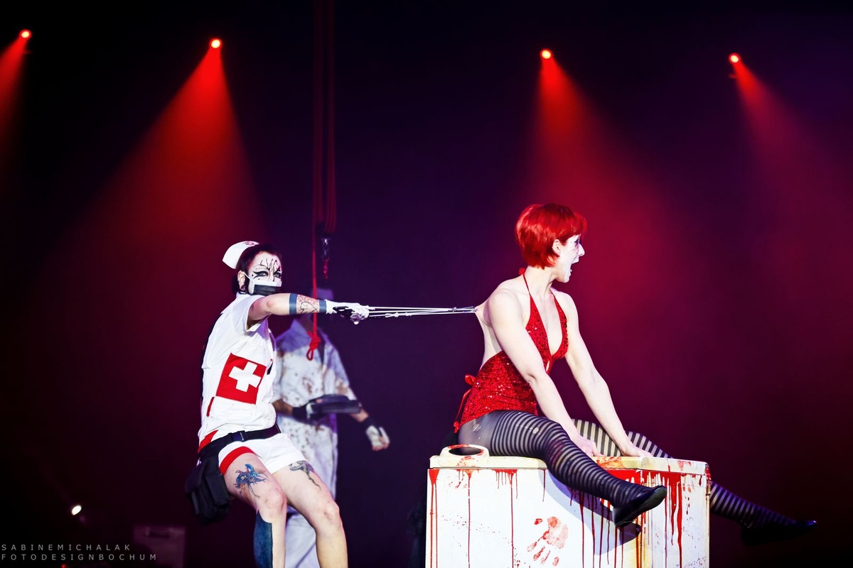 Der Zirkus des Horrors, wie ich finde … eine gelungene Mischung aus hochkarätiger und atemberaubender akrobatischer Zirkuskunst, gepaart mit schaurigen und makaberen Showeinlagen, inszeniert von „horror-like“ geschminkten Künstlern und Artisten…alles gelungen untermalt von tollen Sound- und Lichteffekten.