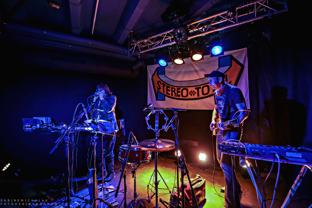 „Stereo Total“ sind total anders, noch mit Jacke an, Schal um und Mütze auf dem Kopf schlenderten sie herein, Getränke hatten sie sich selber mitgebracht und richteten sich gemütlich hinter ihrer doch sehr ungewöhnlichen Instrumentierung auf ihrem knallbunten Bühnenspielplatz ein .
