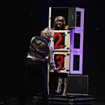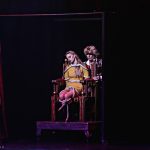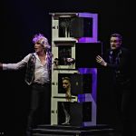 In rasantem Wechsel werden Schachteln, Kisten und Truhen auf die Bühne gerollt, die Klok zerteilt, verdreht, verkleinert, mit Säbeln, Rohren und brennenden Stäben durchbohrt und mit Metallplatten zerstückelt, natürlich nie, ohne dass vorher eine seiner biegsamen Assistentinnen in den schmalen Behausungen Platz nimmt. Dann läßt er diese verschwinden und wieder auftauchen, tauscht sie aus, zieht sie um und an und aus und hin und weg, dann läßt er sie schweben, schiebt sie in der Luft hin und her wie Teppiche, was selbst an einer Zuschauerin aus dem Saal gelingt.. und auch mit Glühbirnen und tanzenden Tüchern.
