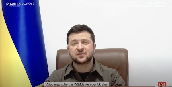 Der Ukrainische Präsident Wolodymyr Selenskyj hält via Videoübertragung eine Rede im Bundestag. Er kritisiert, dass Deutschland sich immer nur an seinen Wirtschaftsinteressen gegenüber Russland orientiert hat. Für die Ukrainer hätte man sich nicht interessiert: „Täglich wiederholen die Politiker „Nie wieder“ – und jetzt sehen wir, dass diese Worte nichts wert sind“. Wieder versuche man, ein ganzes Volk zu vernichten.