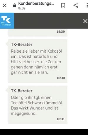 Zecken können Hirnhautentzündung übertragen. Ein Grund, warum die Bundeszentrale für gesundheitliche Aufklärung die Impfung gegen Frühsommer-Meningoenzephalitis (FSME) empfiehlt. Andere medizinische Erkenntnisse hingegen scheinen einem Mitarbeiter des Twitter-Teams der Techniker Krankenkasse vorzuliegen. Er warnt eine offenbar junge Mutter vor der Impfung gegen FSME denn die sei „reine Chemie“ (Und Chemie ist ja bekanntlich noch böser als der gemeine Waldtroll) und empfiehlt Schwarzkümmelöl. Aber auch Kokosöl soll helfen – nicht nur in einer guten Currysauce, sondern auch gegen Zecken: