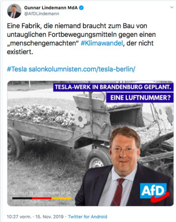 Nun sind ein paar Stunden ins Land gezogen und so ganz falsch lag ich mit meiner Prognose nicht. Die Reiter der Autokalypse haben ihre Pferde gesattelt und machen sich bereit zum Kampf gegen die Tesla-Ansiedlung: