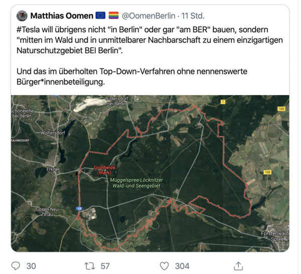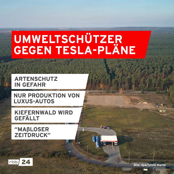 „Die Klimareferentin des BUND, Michaela Kruse, kritisierte am Donnerstag im rbb, in der Fabrik sollten nur SUV gebaut werden. Luxus-Autos allein würden aber bei der Verkehrswende nicht helfen: „Wir können nicht einfach nur den Antrieb ändern und dann sind die Probleme gelöst.“ Wichtiger sei der öffentliche Personennahverkehr, so Kruse. Der BUND möchte deshalb, dass Tesla dort auch Elektrobusse produziert. (…)Der Naturschutzbund Nabu sorgt sich um den Artenschutz auf dem für das Tesla-Werk vorgesehenen Gelände. Nach Angaben von Nabu-Geschäftsführerin Christiane Schröder siedeln auf dem rund 300 Hektar großen Baugrundstück geschützte Reptilienarten sowie Baumfalken und Fledermäuse. 70 Hektar Kiefernwald müssen dort gerodet werden. Tesla will dafür andernorts 210 Hektar bepflanzen.