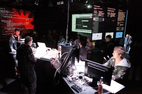 Zunächst deutet nichts darauf hin: Düster dräuen die Sounds aus den Lautsprechern. Ein veritabler Horrorfilm-Soundtrack empfängt die Besucher. Auf den semitransparenten Leinwänden im Raum ist immer wieder „(_clear)“ zu lesen. Sitzplätze gibt es nicht, die Zuschauer sollen sich zwischen den Projektionen bewegen, wer aber nicht stehen will oder kann, bekommt dann doch einen Stuhl. Leicht aus dem Zentrum des Raumes gerückt stehen Daniel Hengst, Rolf Meinecke und Martin Juhls in Kapuzenoveralls mit digitalen Camouflage-Prints an einer Batterie leuchtender Computerbildschirme. Kampfbereit für die letzte digitale Schlacht.