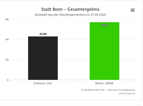 18.43 Uhr: Katja Dörner (Grüne) gewinnt Bonn und schlägt Amtsinhaber Ashok-Alexander Sridharan (CDU)