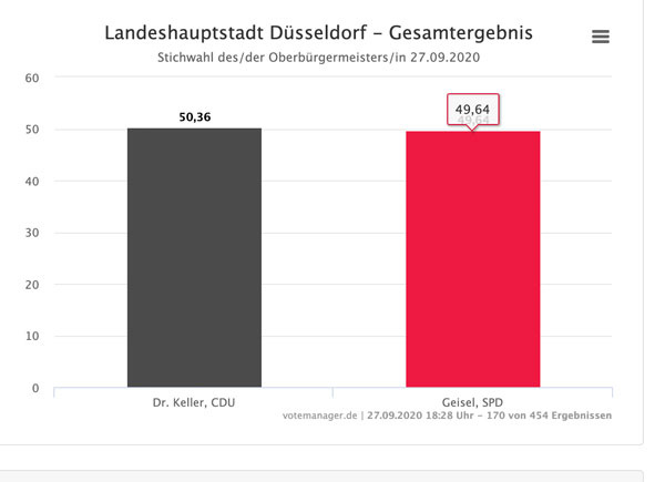 18.28 Uhr: Kopf an Kopf Rennen in Düsseldorf. Für OB Thomas Geisel (SPD) wird es eng. Sehr eng: