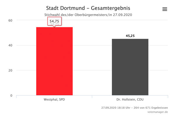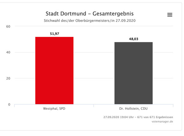 19.06 Uhr: Uhr: Thomas Westphal (SPD) hat es geschafft. Obwohl die Grünen zu Wahl des CDU-OB-Kandidaten Andreas Hollstein aufriefen, hat Westphal am Ende gewonnen. Dortmund, die einstige „Herzkammer der Sozialdemokratie“ (Herbert Wehner) wird weiterhin einen roten Oberbürgermeister haben.