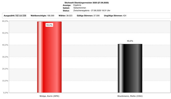 18.33 Uhr: In Gelsenkirchen lässt Karin Welge nichts anbrennen: 182 von 206 Wahlbezrike sind ausgewählt, Welke hat fast 60 Prozent. Das wars dann wohl.