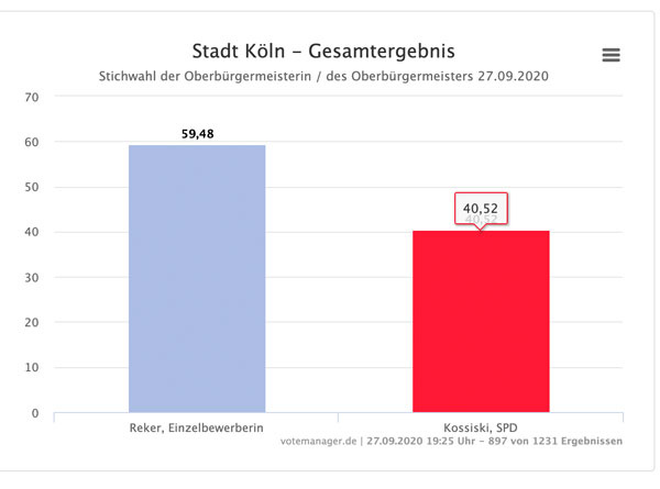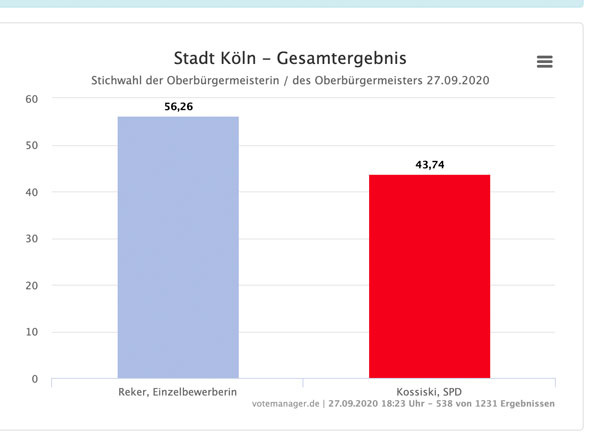 18.35 Uhr Auch in Köln ist die Wahl gelaufen. Nach der Auszählung von von Wahlbezirken liegt die von CDU und Grünen unterstütze amtierende Oberbürgermeisterin Henriette Reker (Parteilos) uneinholbar vorne.