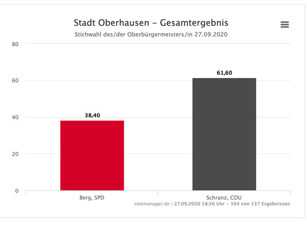 18.38 Uhr: Auch in Oberhausen ist die Wahl gelaufen. OB Daniel Schranz (CDU) liegt deutlich vorne.