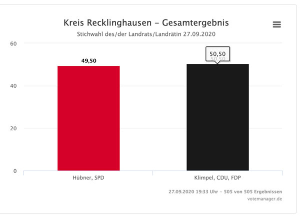 19.33 Uhr: Fotofinish: Der bisherige Halterner Bürgermeister Bodo Klimpel setzt sich knapp denen Michael Hübner (MdL/SPD) durch und wird neuer Landrat des Kreises Recklinghausen. Der Kreis hat 614.137 Einwohner. In keinem Landkreis in Deutschland leben mehr Menschen.