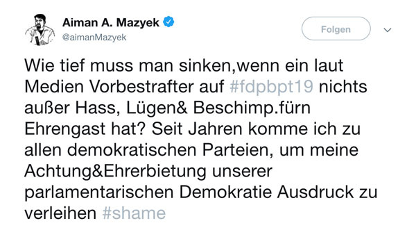 ich habe auf dem Bundesparteitag der Freien Demokraten am Wochenende eine Rede von exakt 118 Sekunden Dauer gehalten. Darin habe ich mir erlaubt, ohne Umschweife Tacheles zu reden über Ihren umstrittenen Lobbyverband „Zentralrat der Muslime“, als dessen oberster Vertreter Sie den Parteitag besucht hatten. Jedes meiner Worte war wohl überlegt und der Inhalt meiner Rede lückenlos durch mehrere seriöse Quellen belegbar.