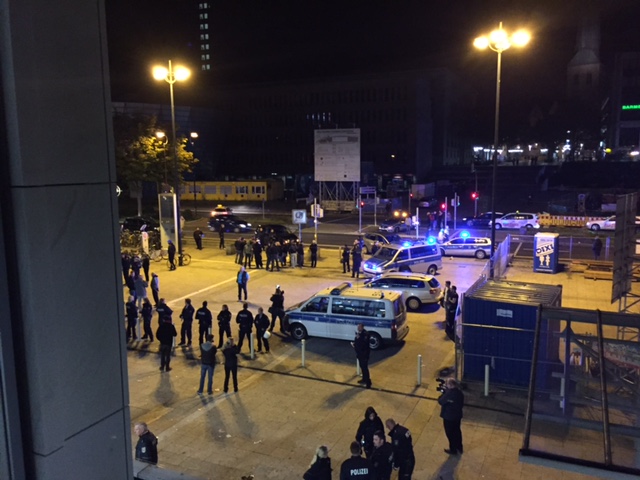 1.25 Uhr: Verwirrung. Nazis sollen sich nicht mehr im Hauptbahnhof befinden und in Richtung Innenstadt gezogen sein. Vor dem Haupteingang zieht die Polizei starke Kräfte zusammen und riegelt den Eingang völlig ab. Selbst mit Presseausweis gibt es zur Zeit keinen Zugang.
