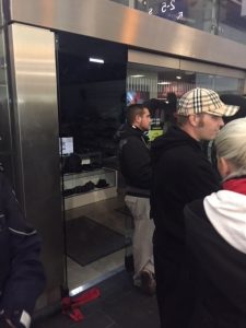 3.10 Uhr: Korrektur: Die Nazis haben ihre Kundgebung vor dem Bahnhof abgehalten und sind danach von der Polizei in den Bahnhof geführt worden. Warum auch immer, vielleicht um sich vor irgendjemandem zu verstecken, haben die Nazis in der Vorhalle die Tür eines Schuhgeschäftes eingedrückt. Merkwürdiges Verhältnis zum Eigentum anderer Leute legten die Kameraden da an den Tag. Anschließend wurde die Gruppe auf das S-Bahn Gleis geführt, um von dort aus dem Bahnhof transportiert zu werden.