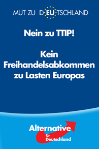 Die Gegner von TTIP spielen mit der Angst der Menschen – sie versuchen, ihren politischen Profit daraus zu schlagen. Ob das Arbeitsplätze kostet oder nicht ist egal – es geht um Macht. Und Menschen die Angst haben wollen eine starken Staat, sind bereit die eigenen und die Freiräume anderer gegen eine vermeintliche Sicherheit einzutauschen. An TTIP kann man sehr gut die unterschiedliche Grundhaltung der Parteien erkennen – CDU, SPD und die nicht mehr im Bundestag vertretene FDP setzen nicht darauf, den Menschen Angst zu machen. Sie setzen sich für eine langfristige Entwicklung ein und instrumentalisieren nicht die Furcht der Menschen vor Neuem. AfD, Grüne, Linke, NPD und auch die Piraten, deren Plakat ich aus Gründen des Layouts und der sinkenden Bedeutung nicht eingefügt habe, spielen mit den Ängsten. Es sind übrigens Ängste gegen das angeblich Fremde, gegen die USA, die angeblich unsere ach so tollen Sitten und Gebräuche nicht akzeptieren wollen – Fremdenfeindlichkeit und die Angst vor den Anderen ist ein gemeinsames Motiv. Wer mit Ängsten spielt, setzt immer auf autoritäre Lösungen, auf mehr Staat, auf weniger Freiräume.