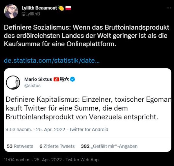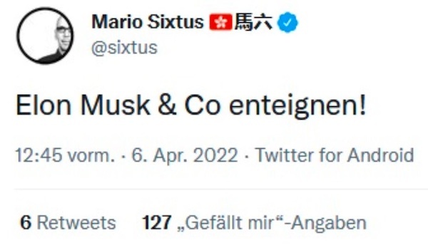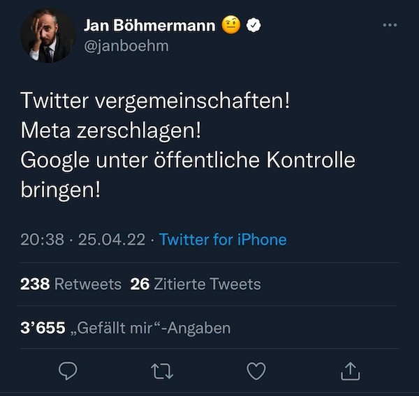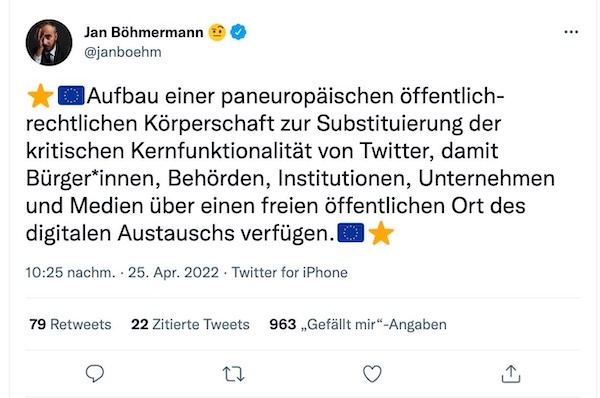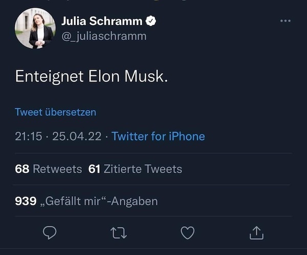 Musk als Besitzer von Twitter ist mir allemal lieber, als ein öffentlich-rechtlicher Kurznachrichtendienst, bei dem ich ein weiteres Mal gezwungen wäre, Humorbeamte wie Böhmermann oder einen Troll wie Sixtus mit Gebühren durchzufüttern. Und ein Medien, in dem eine irrlichternde Parteihopperin wie Julia Schramm, zurzeit bei der Linkspartei, das Sagen hat, wäre langweilig, dumm und öde.