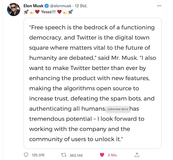 Elon Musk hat Twitter gekauft. Ich mag Twitter nicht besonders und im Kern ist mir egal, wem es gehört. Aber wenn ich sehe, wer jetzt gerade steil geht, scheint doch alles in die richtige Richtung zu laufen: