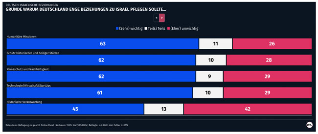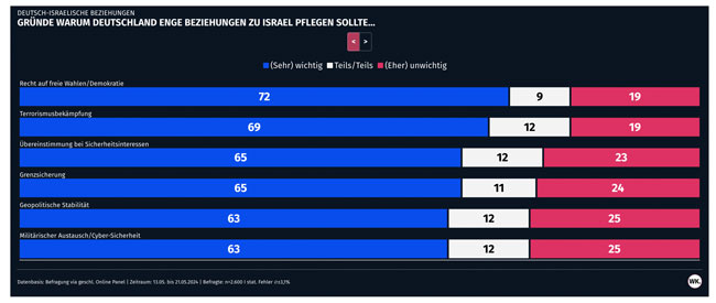 Die drei Hauptgründe, Israel zu unterstützen, sind nach der Umfrage von Wahlkreisprognose demnach, dass es sich bei Israel um einen demokratischen Staat handelt, man gemeinsame Interessen bei der Terrorismusbekämpfung hat und dieselben Sicherheitsinteressen teilt. Die deutsche Geschichte spielt für weniger als jeden Zweiten eine wichtige Rolle. Israel ist eine Demokratie und hat dieselben Feinde wie Deutschland.