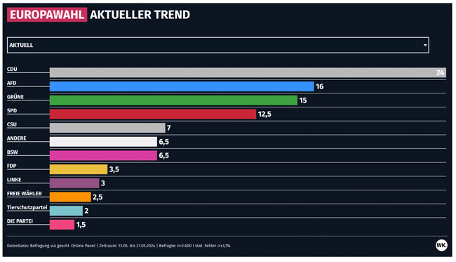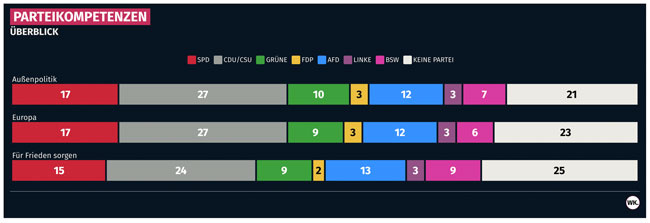 Die Unionsparteien kommen zusammen auf 31 Prozent, die AfD auf 16, die Grünen auf 15 und die SPD auf nur 12,5 Prozent. Die FDP liegt mit 3,4 Prozent deutlich hinter den Wagenknechten mit 6,5 Prozent.