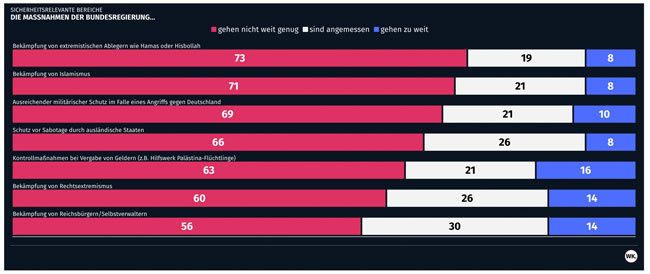 Vom Terroristenstaat zum Thema Sicherheit ist der Weg nicht weit. 73 Prozent aller Befragten wünschen sich härtere Maßnahmen gegen Terroristengruppen wie die Hamas und den Islamischen Staat. Keine guten Nachrichten für deren Freunde, die zurzeit Hochschulen besetzen. Auch der Islamismus und die Möglichkeit eines militärischen Angriffs beunruhigen die Menschen: